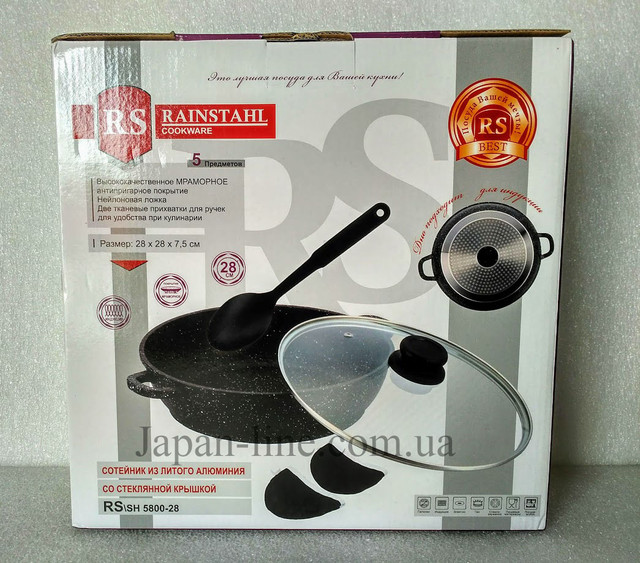Міцний сотейник Rainstahl RS \ SH 5800-28 black вилитий з пресованого алюмінію. І покрить ираморним напиленням. Це дозволить готувати страви з мінімальною кількістю жиру. Сотейник має систему Turbo індукції апоптозу. Завдяки цьому, місткість в ньому швидко стає гарячим. Можливість приготування їжі в печі (без кришки) за температури від 20 до 220 ° С. Потрійний шар напилення мармуру, робить сотейник надзвичайно стійким до подряпин. На ньому можливо готувати смачні і здорові страви, які не втрачають соковитості і поживні цінностей. Підходить для всіх типів плит: газові, електричні, керамічні, галогенні і індукційні.